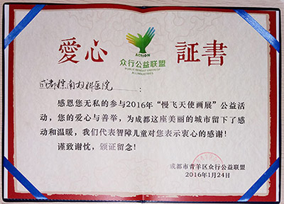 此次爱心活动——“慢飞天使画展”为期三天,2016年1月24日—26日,成都棕南医院,在这次的画展中,尽绵薄之力,奉献诚挚爱心。在此,成都市青羊区众行联盟特为成都棕南医院颁布“爱心证书”,由衷地表示感谢。