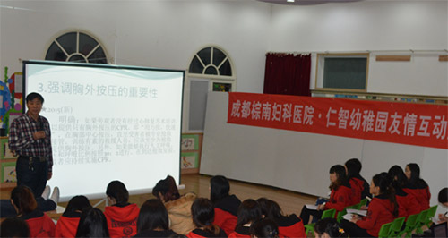 成都棕南医院与仁智幼稚园进行友情互动,主要讲解急诊急救措施,因为智障儿童缺乏正常的行为能力,需要老师们在面对突发情况时,掌握一定的应急技巧;成都棕南医院特派出本院张庆芳、陈德萍等医生协助智障儿童在绘画时的健康工作。